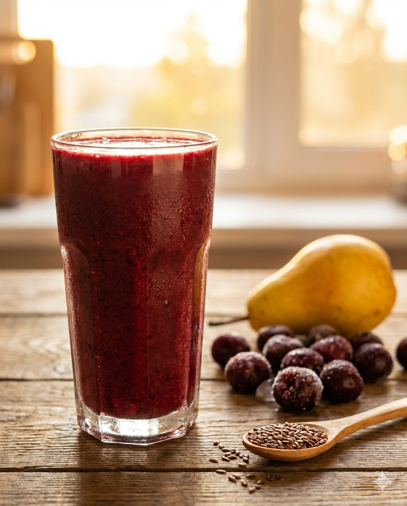 Лютий — ідеальний час для розвантаження організму перед початком весни. Цей смузі поєднує в собі насичений смак замороженої вишні та користь насіння льону, яке є потужним природним сорбентом. Напій допомагає м’яко очистити кишечник, покращити стан шкіри та наповнити організм антиоксидантами. Завдяки груші смузі має приємну солодкість та ніжну текстуру. Це справжній вітамінний коктейль для тих, хто прагне легкості