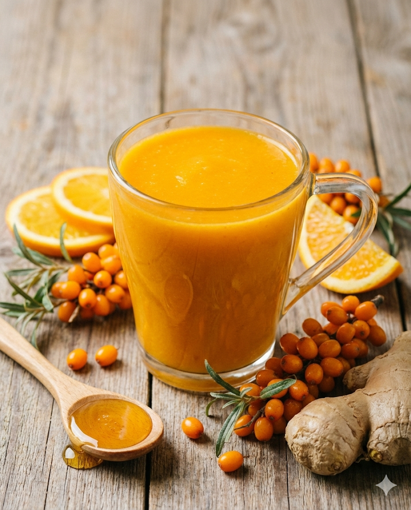 Лютий — це місяць, коли організм найбільше потребує вітамінної підтримки в очікуванні весни. Цей яскраво-помаранчевий смузі працює як природний енергетик завдяки потужному поєднанню обліпихи та цитрусових. Імбир додає зігріваючого ефекту та прискорює метаболізм, а мед пом'якшує смак. Ця версія має більш рідку, питну текстуру — ідеально для легкого старту дня без зайвого навантаження на шлунок.